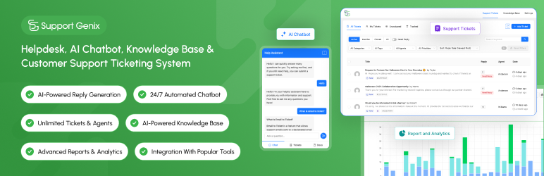 Support Genix is a powerful, AI-powered helpdesk plugin for WordPress, designed to simplify customer support management with intelligent automation. Manage support tickets in one place, boost productivity with AI-powered reply generation, create knowledge base docs with AI and enhance customer satisfaction with 24/7 automated chatbot support.